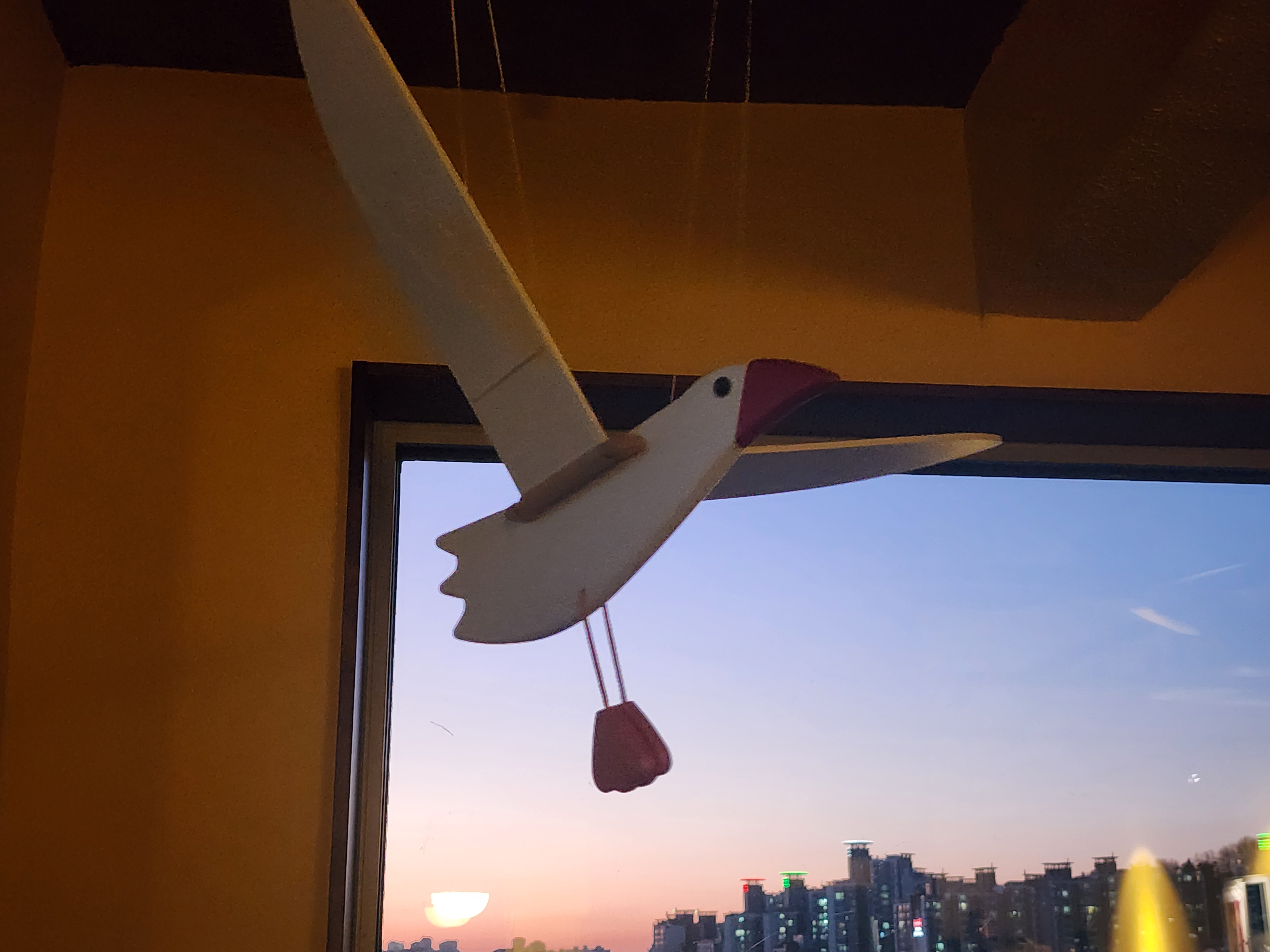 - 하얀 갈매기 모빌이 창문 너머로 나는 모습