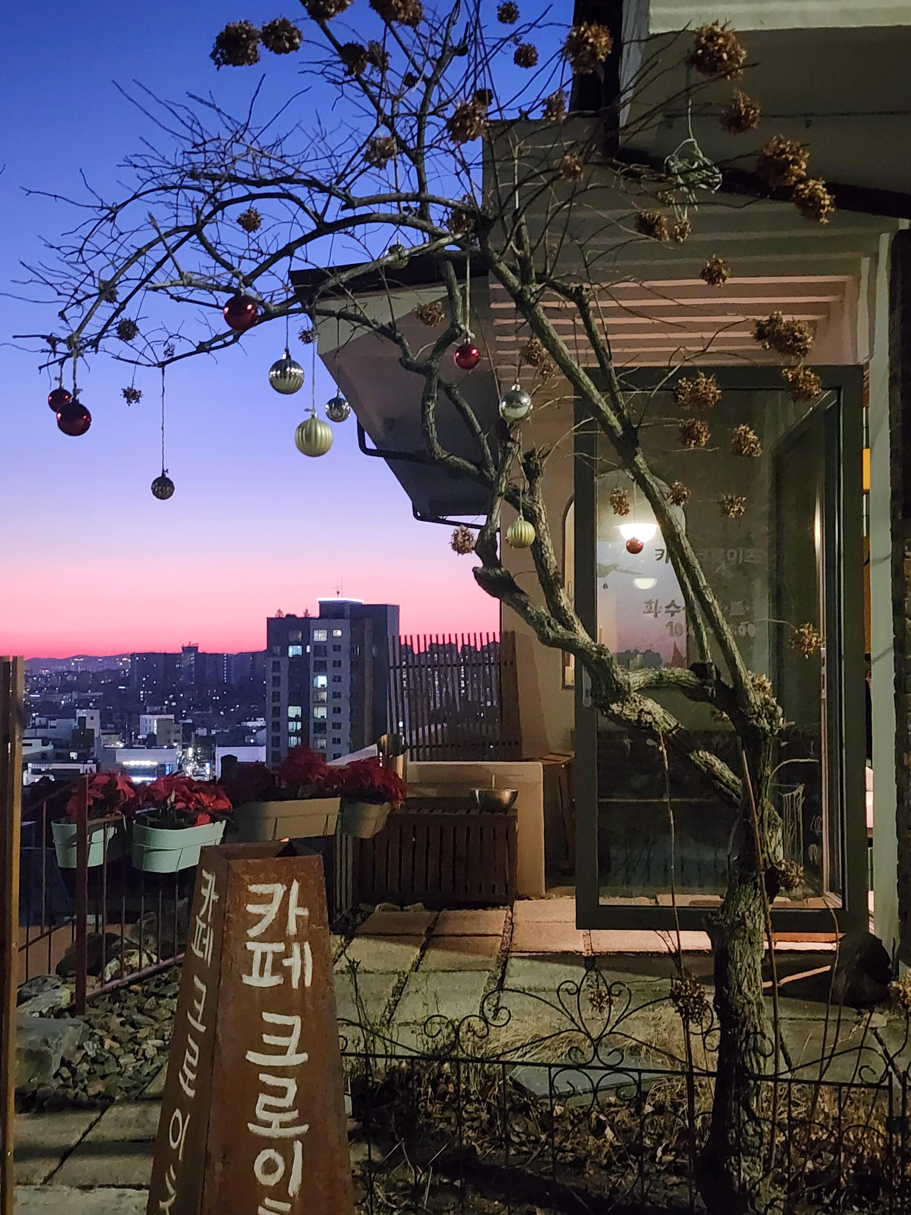 카페에 도착했을 때는 마침 해가 뉘엿뉘엿 지고 있었어. 붉은 노을이 보랏빛 어둠으로 바뀌는 매직 아워에 만난 크로이츠의 녹슨 철제 간판과 앙상한 겨울 나무는 정말 유럽의 시골 마을 같은 분위기를 자아냈어.