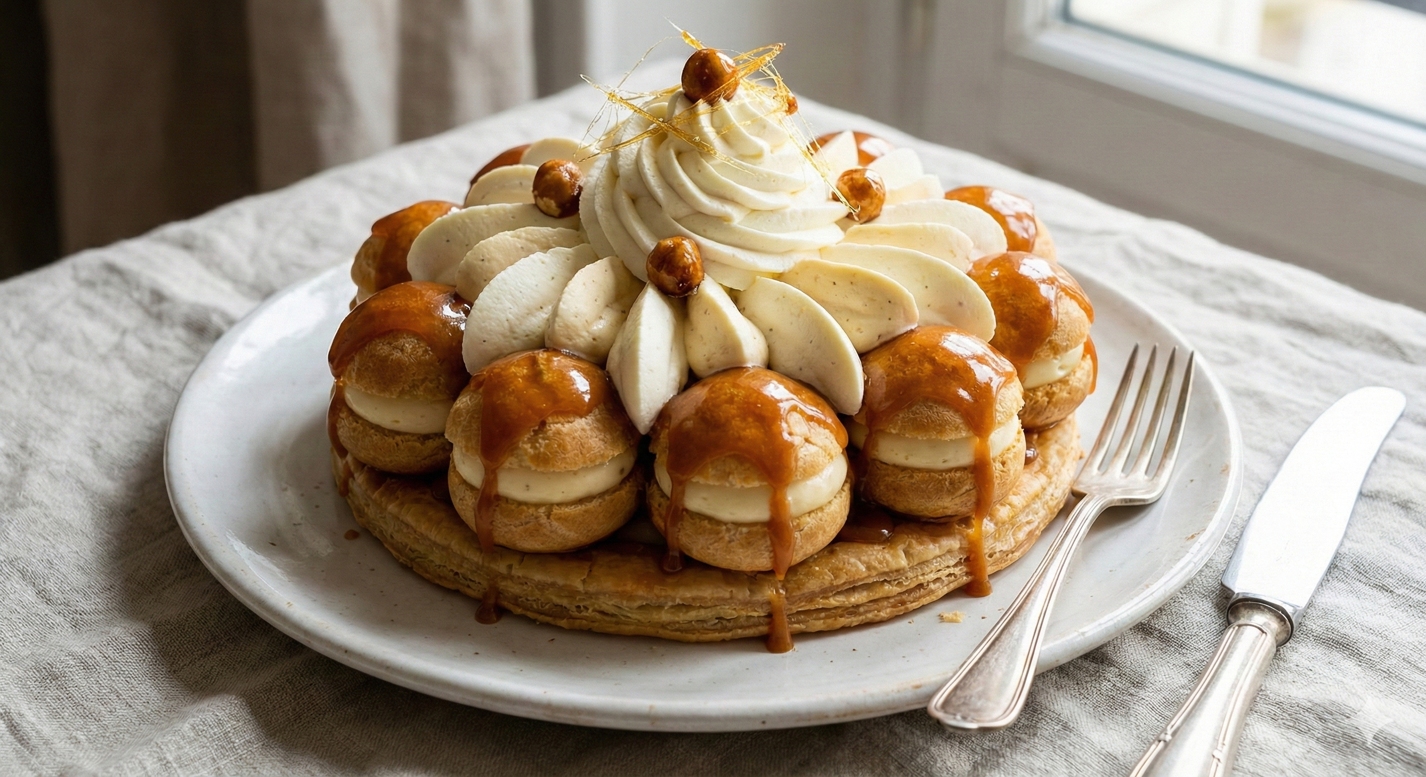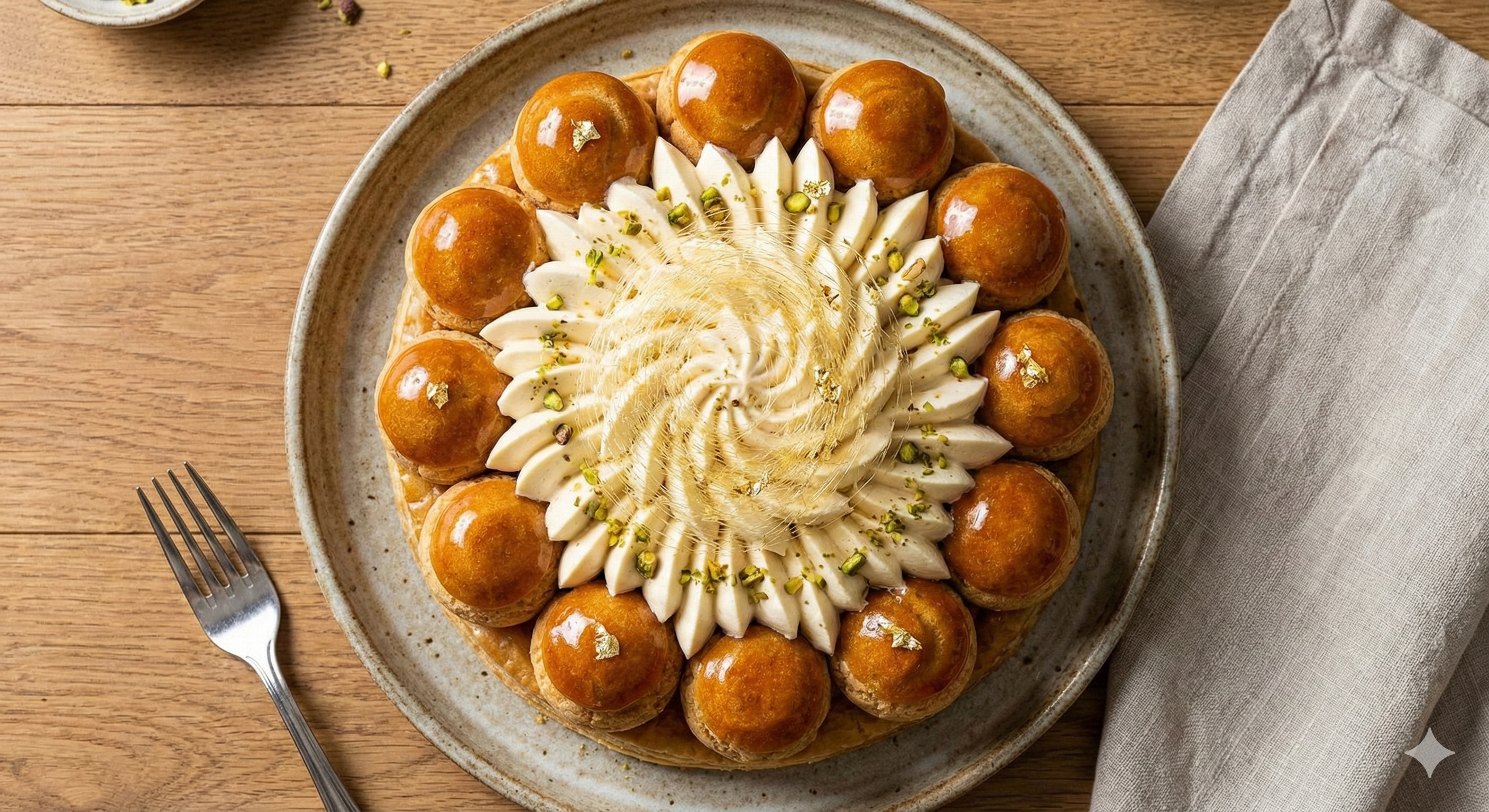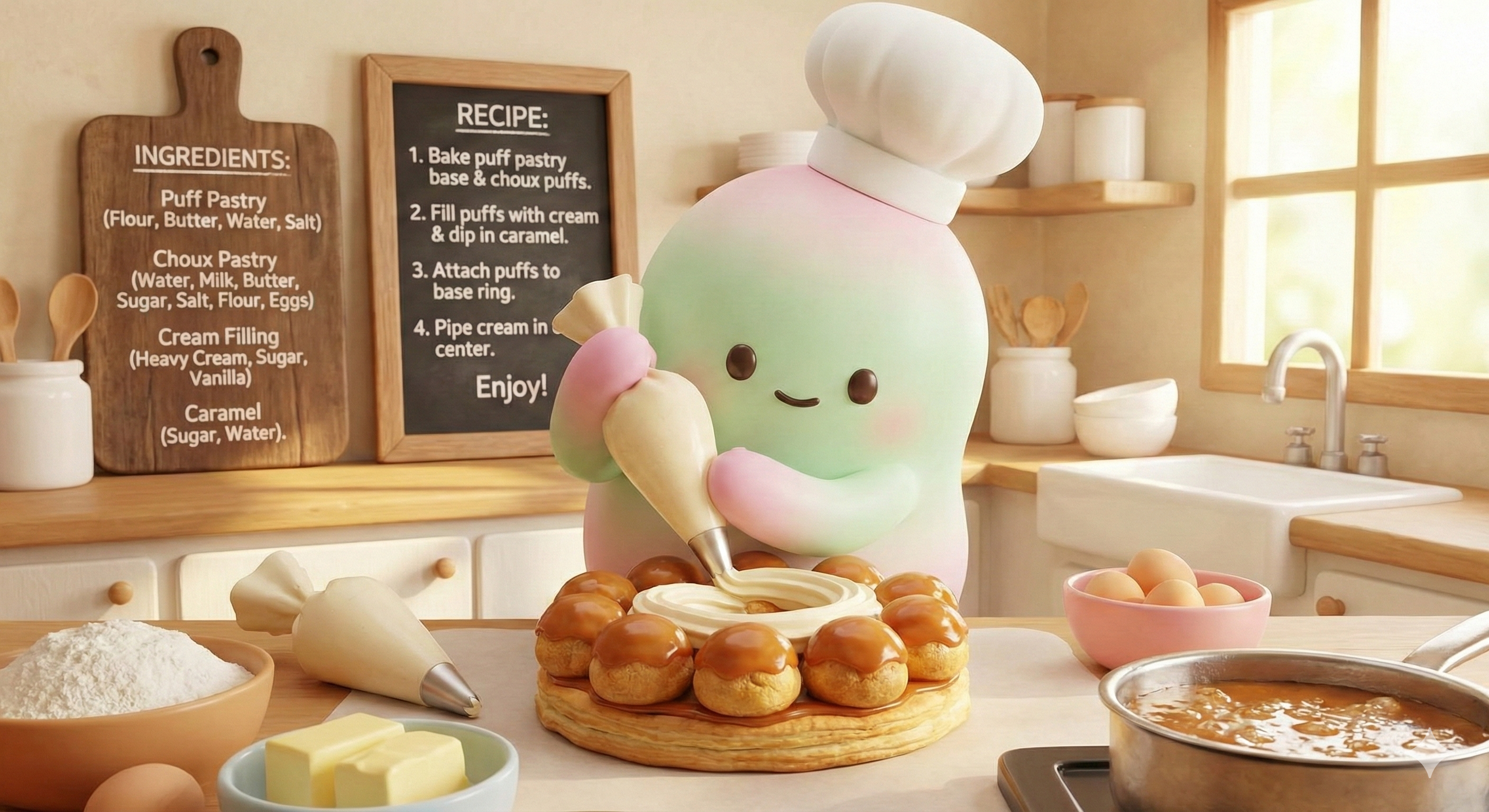 바삭한 파이 바닥 위에 크림을 채운 작은 **‘슈(choux)’**들을 올려 왕관 모양을 만드는 게 가장 클래식한 버전이야! 마치 왕관을 쓴 것처럼 화려하고 우아하지?