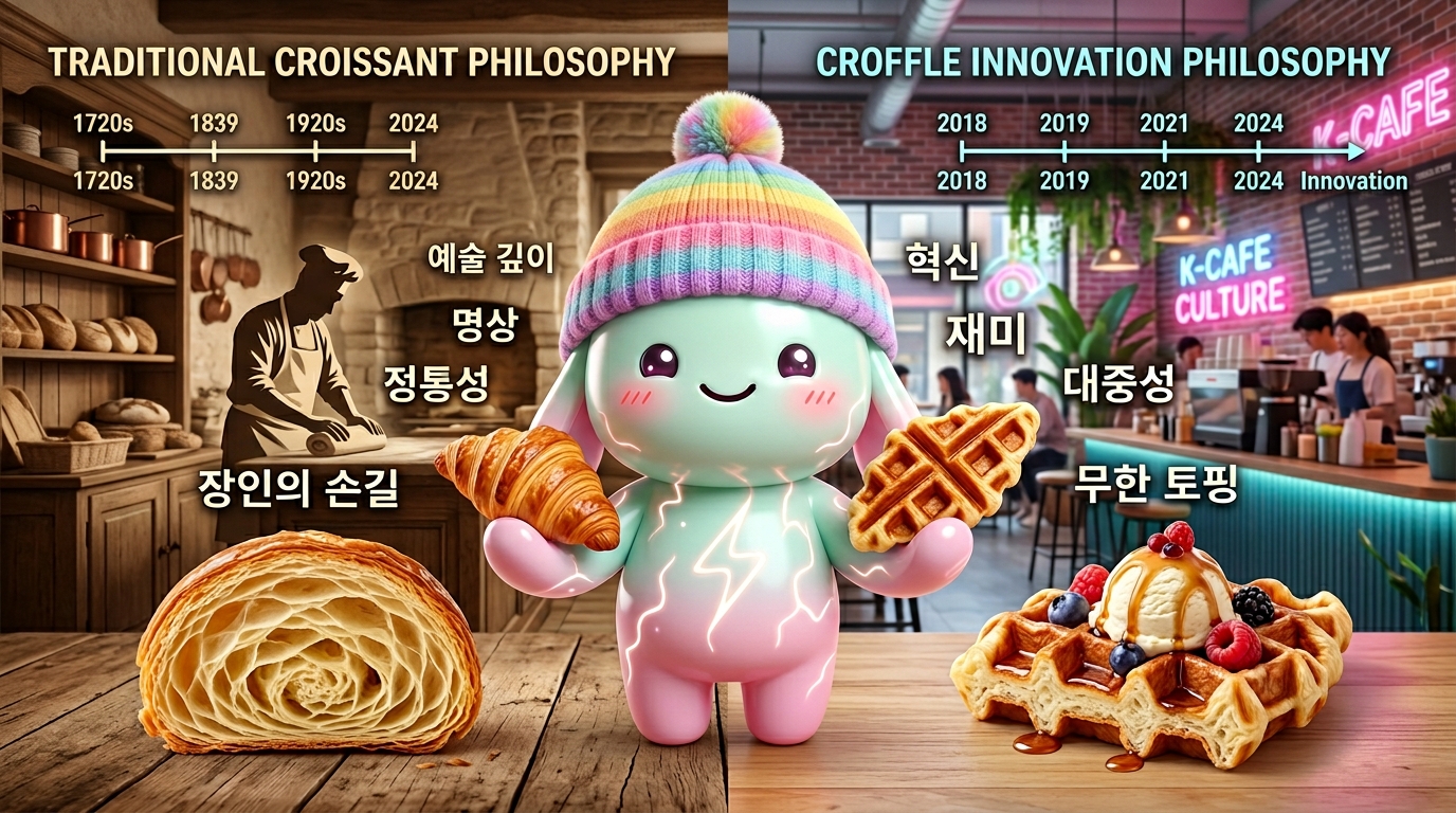 정통 크로아상을 먹을 때는, 그 한 입 안에 담긴 300년 역사를 생각하면서 천천히 씹어. 그리고 크로플을 먹을 때는, 한국 문화가 외래 음식을 얼마나 창의적으로 재해석했는지를 생각해봐. 둘 다 완벽하고, 둘 다 사랑받을 가치가 있어.