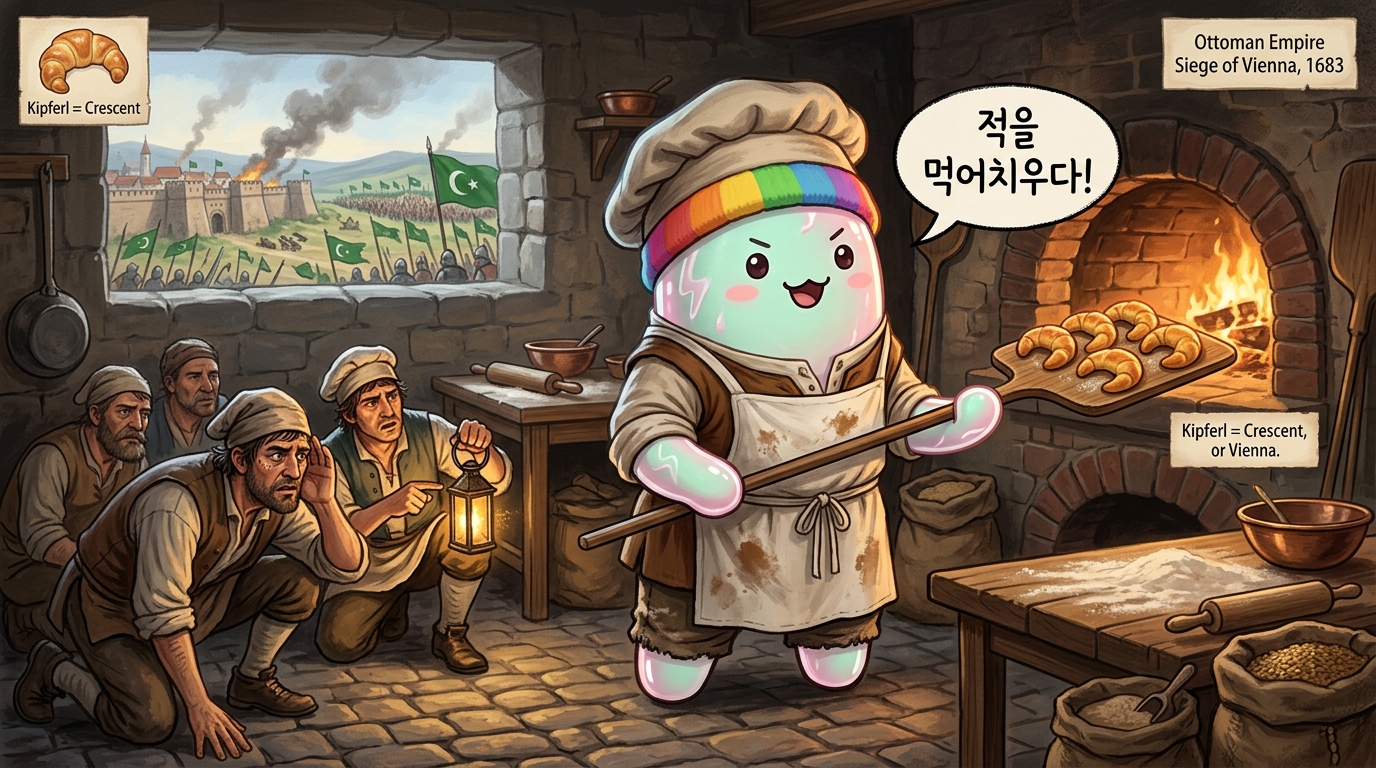 1683년, 오스만 제국이 빈(비엔나)을 포위했을 때의 이야기야. 오스만군은 도시를 점령하려고 지하 터널을 파고 있었는데, 당시 비엔나의 제빵사들이 이를 발견하게 돼. 제빵사들의 용감한 신고 덕분에 비엔나가 성공적으로 방어할 수 있었거든. 그리고 승리를 축하하며, 제빵사들이 만든 초승달 모양의 빵이 바로 키프펠였어. 초승달은 오스만 제국의 상징이니까, 적을 이긴 승리를 기념하는 의미로 적의 상징을 빵으로 만들어 먹었던 거지. (물론 이건 여러 버전 중 하나일 뿐이고, 정확한 기원은 여전히 논쟁 중이야.)
