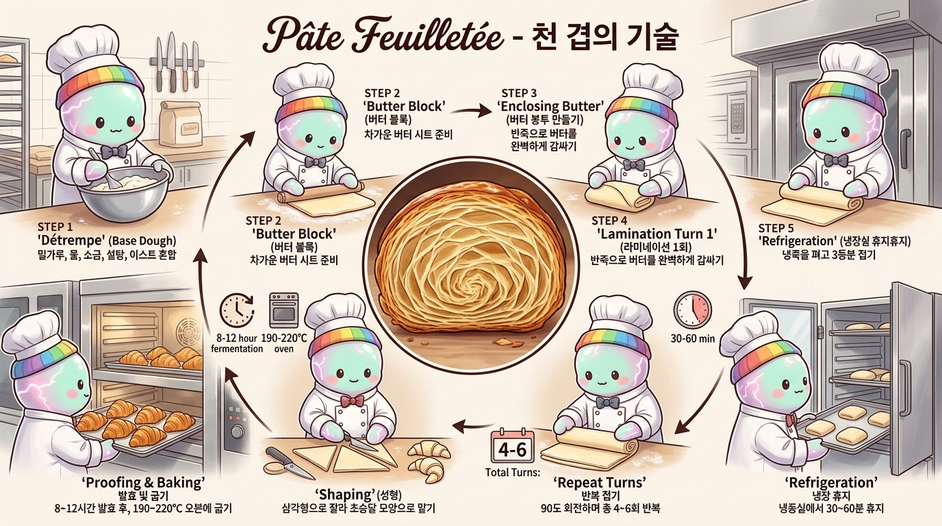 - 베이스 반죽 (Détrempe): 밀가루·물·소금·설탕·이스트로 기본 반죽을 만들어.