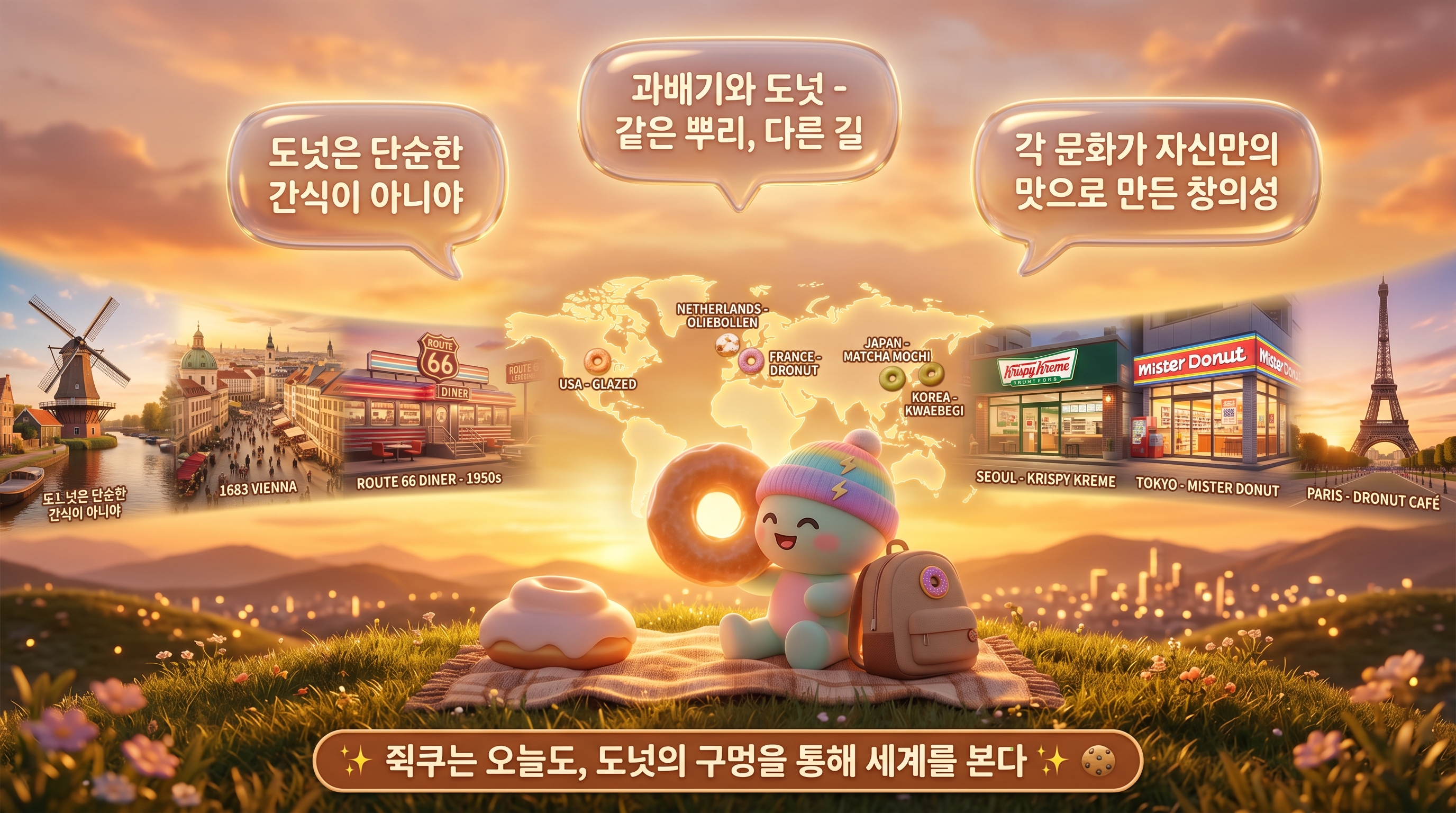 도넛을 먹을 때, 그냥 달콤한 간식으로 먹지 말고, 역사를 생각해봐. 300년 전 네덜란드 할머니의 실수에서 시작된 구멍, 그 구멍이 어떻게 세계를 사로잡았는지. 그리고 각 나라가 도넛을 받아들이면서 자신만의 맛으로 만들어낸 창의성을 말이야.