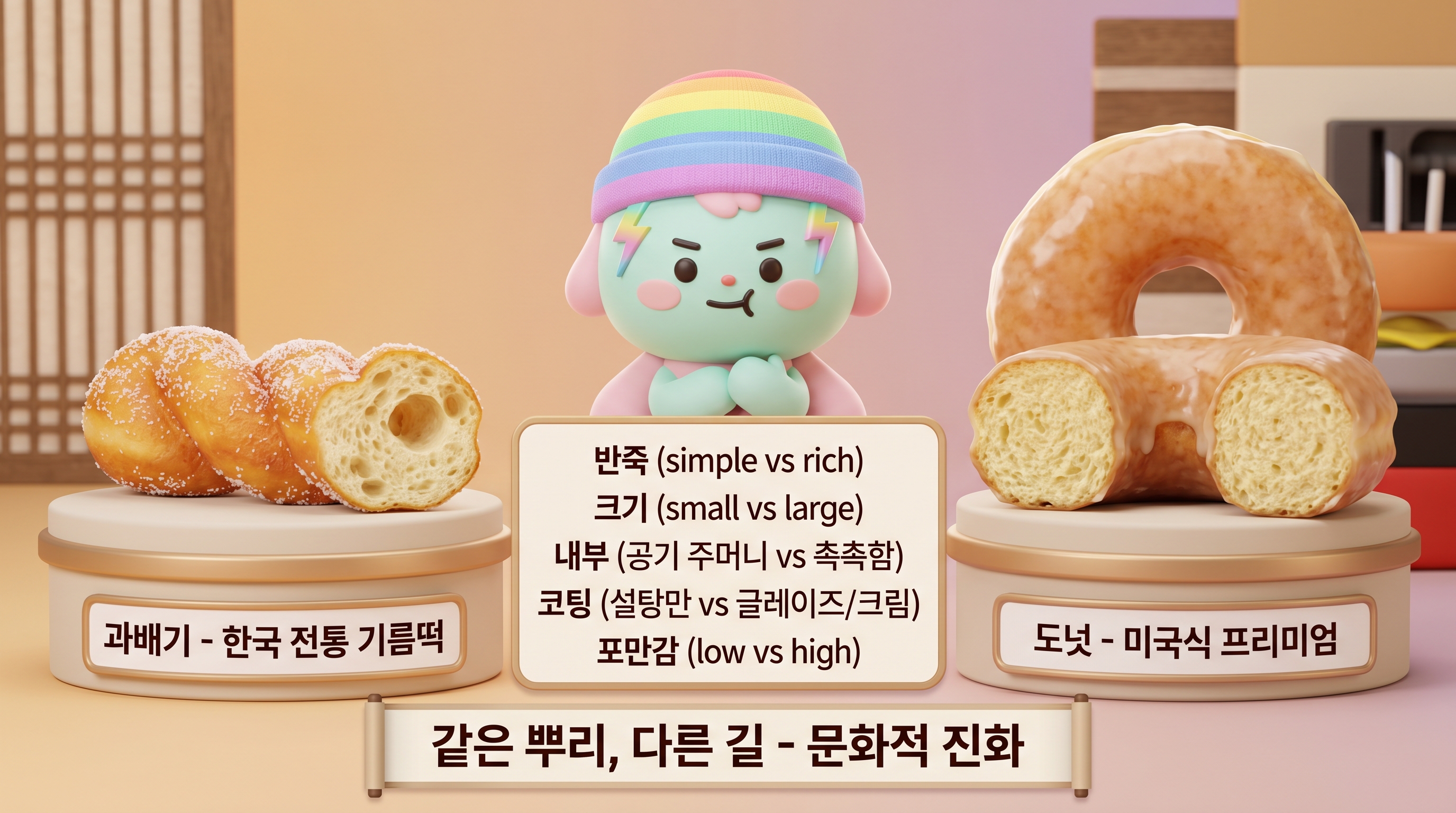 과배기는 '가난한 집도 누군가는 달콤한 걸 먹고 싶다’는 바람의 결과물이고, 도넛은 '미국식 효율성과 대량 생산이 어떻게 음식 문화를 바꿀 수 있는가’에 대한 답이야.