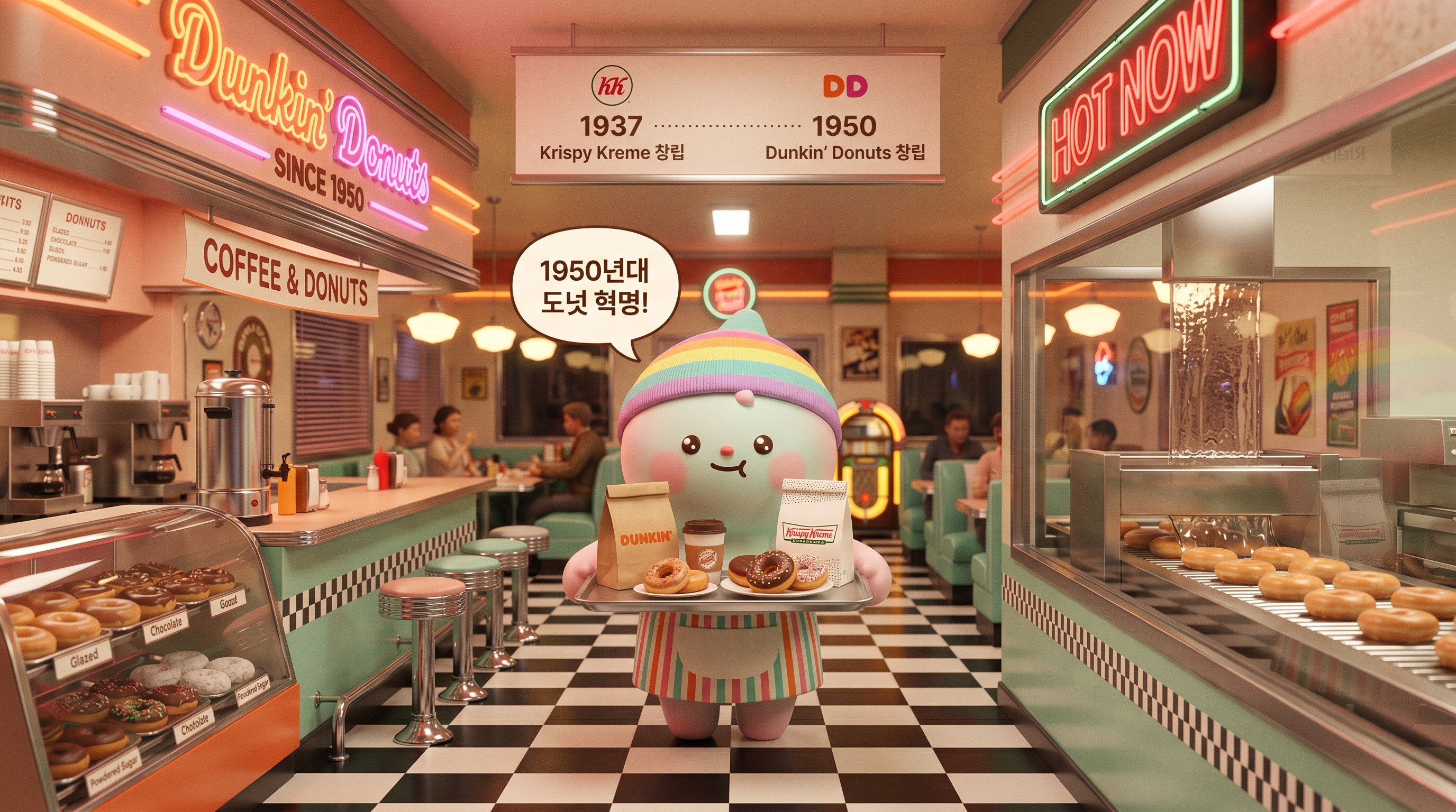 1950년, 매사추세츠주 퀸시에서 윌리엄 로젠버그(William Rosenberg)가 ‘던킨 도넛(Dunkin’ Donuts)'을 창립했어. 이게 정말 중요한 시점이었어. 왜냐하면 도넛이 처음으로 대량 생산·프랜차이즈 시스템을 도입한 거거든.