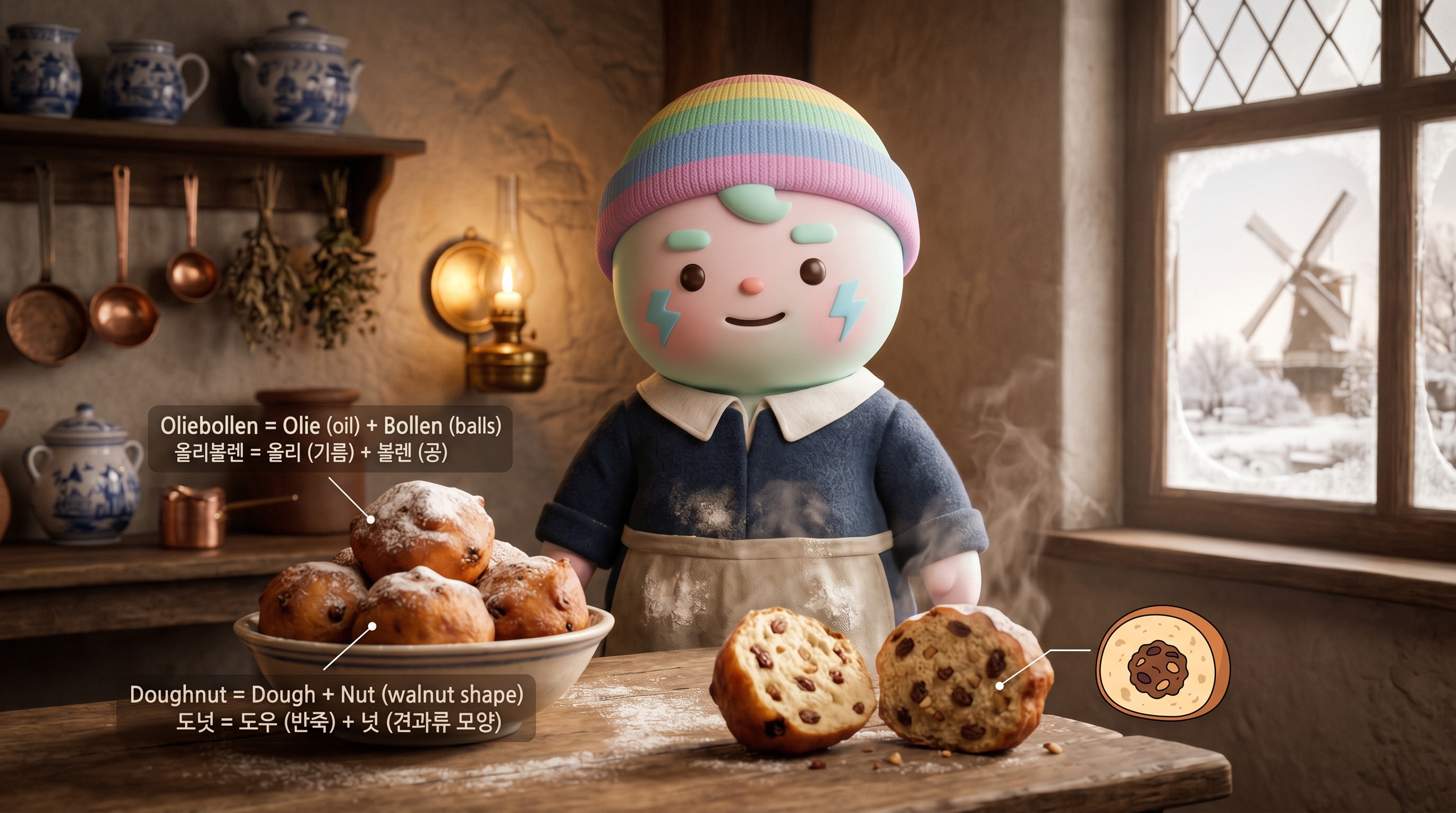 도넛의 진정한 기원은 **네덜란드의 올리볼(Oliebollen)**이야. 올리볼은 'Olie(기름)'와 'Bollen(공 모양의 것)'의 합성어로, 말 그대로 '기름에 튀긴 공 모양의 반죽’이라는 뜻이야.