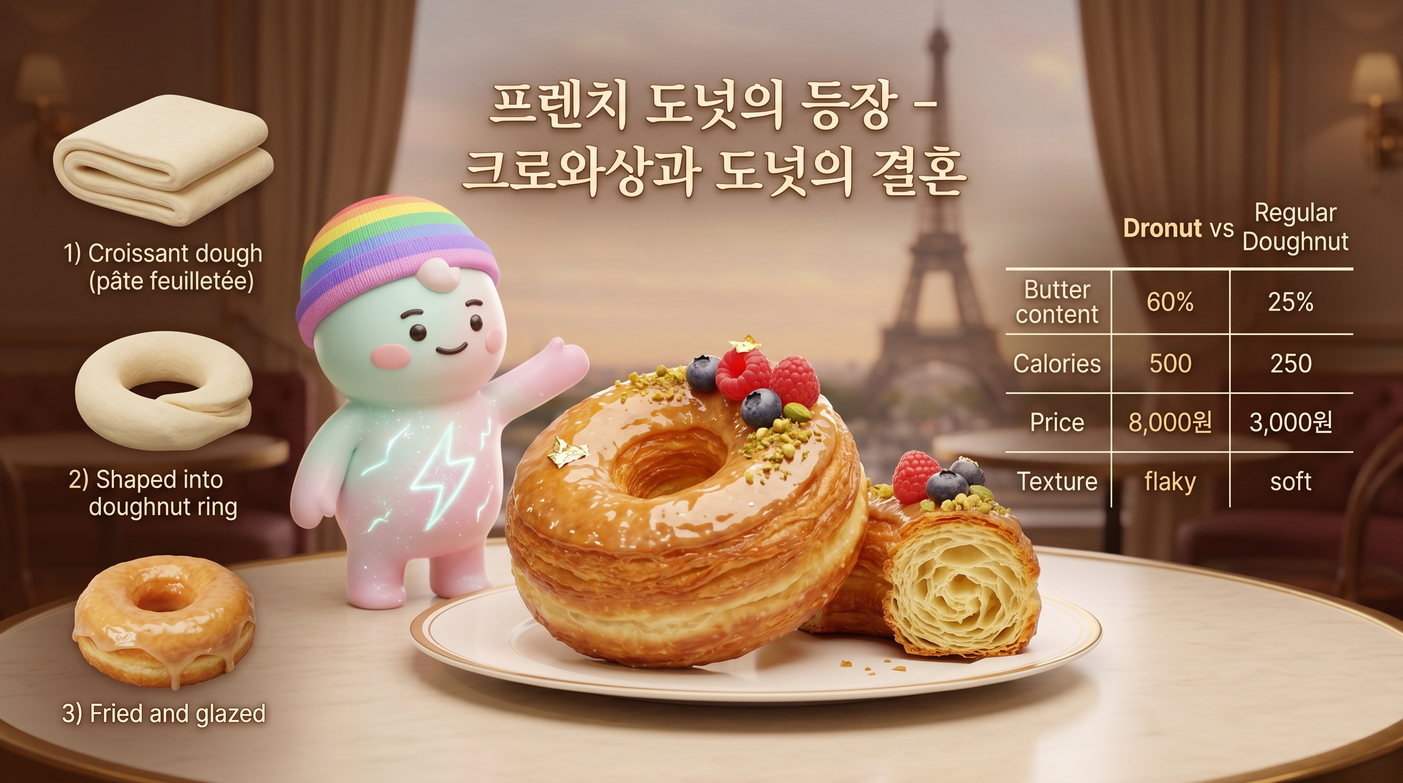 그리고 요즘의 드로우드는? 이건 '크로아상과 도넛의 결혼’이야. 왜 이런 게 나왔을까? 왜냐하면 인류는 항상 '더 맛있는 것’을 추구하거든. 도넛의 바삭함과 버터 크로아상의 고급스러움을 합쳤을 때, 뭔가 더 특별한 게 나올 수 있다는 걸 알았던 거야.