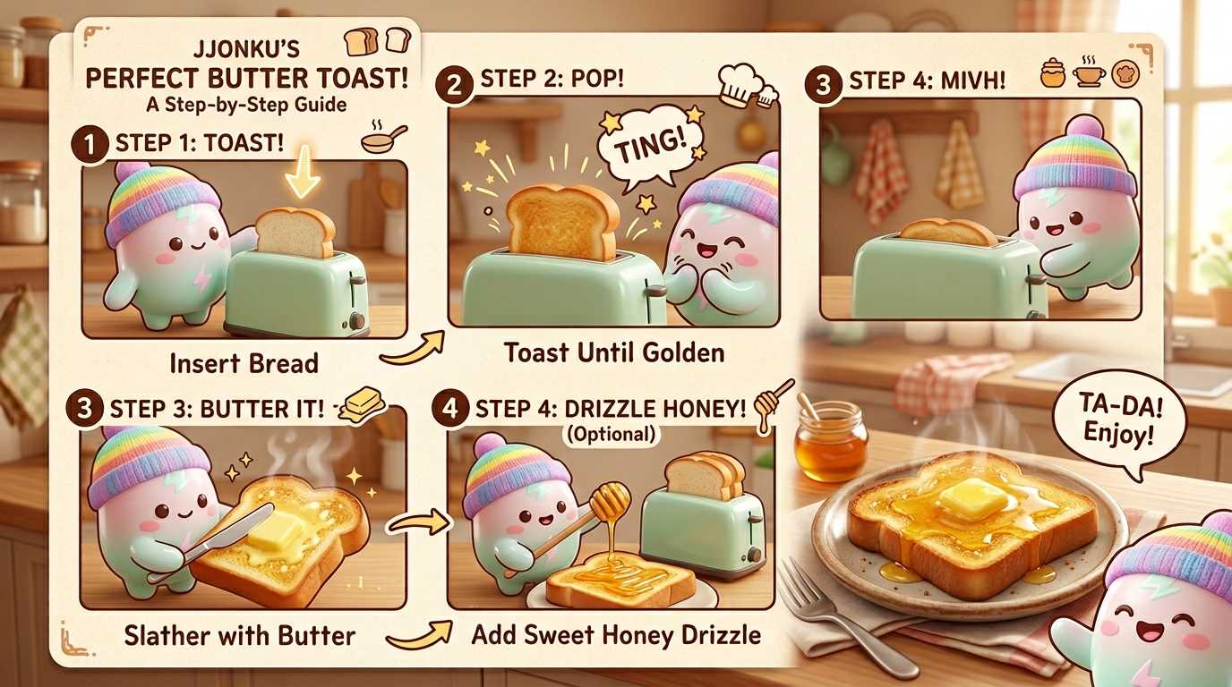 토스터에 식빵 넣고 황금빛이 될 때까지 구워. “팅!” 하고 튀어나오는 순간 버터를 쓱싹 발라! 열기에 버터가 스르륵 녹으면서 빵 속으로 스며드는 그 순간이 천국이야!