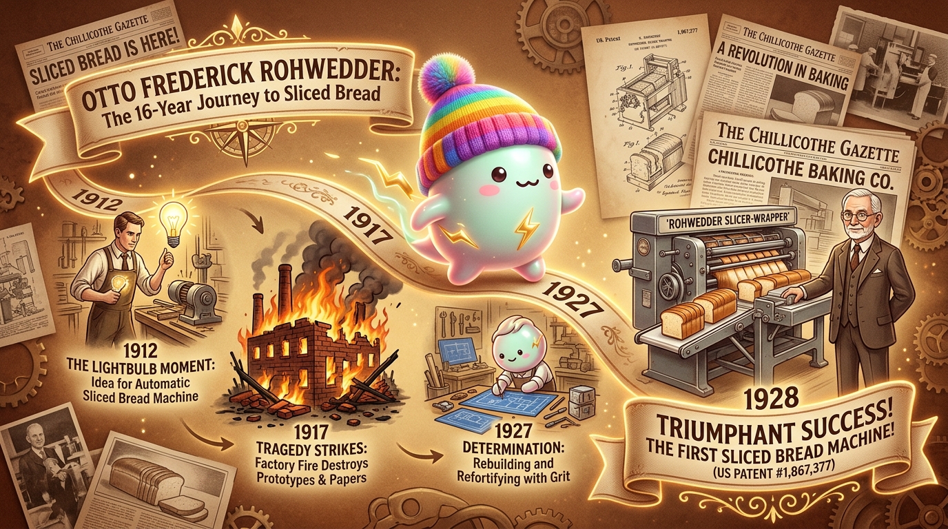 1912년, 미국 아이오와의 보석상이자 발명가 오토 로베더는 **“빵을 미리 잘라서 팔면 어떨까?”**라는 아이디어를 떠올렸어.