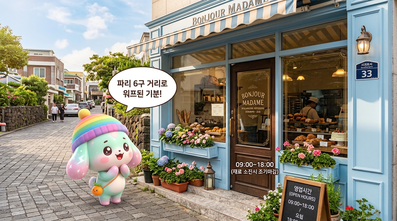 차를 타고 가다가 서귀포시 대청로 33번지에 도착했을 때, 쫀쿠는 눈을 의심했어. 푸른색 외관의 가게가 나타났는데, 이게 정말 제주도 서귀포라고? 청담동에 있어도 어색하지 않을 정도의 유럽 시골 마을 감성이 그대로 느껴졌거든. 창문 너머로 보이는 가게 인테리어도 프랑스의 작은 제과점을 완벽히 재현한 듯했어. 마치 내가 갑자기 파리 6구 거리로 워프된 기분이 들었다니까.
