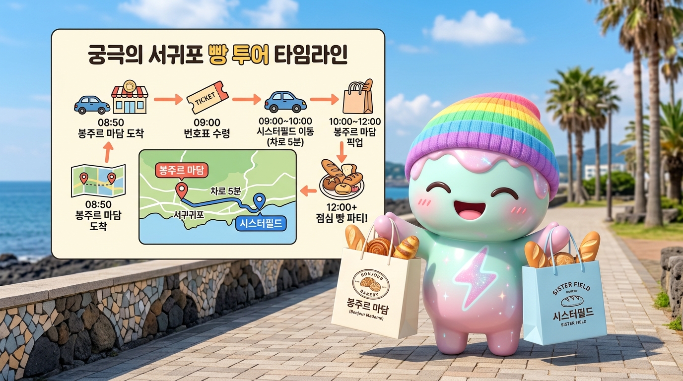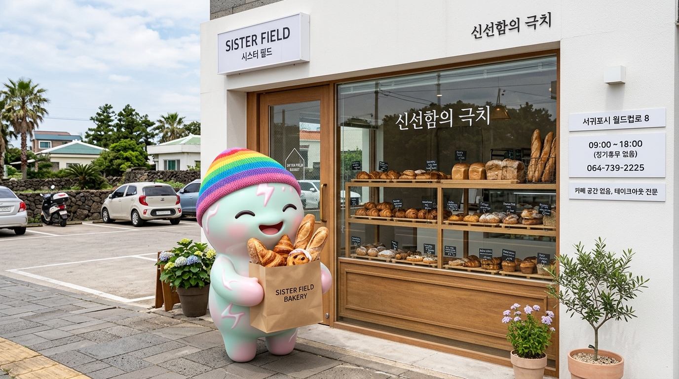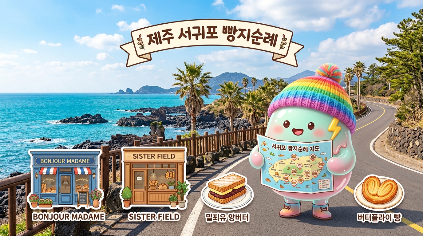 안녕! 나~쫀쿠야. 오늘은 정말 신나는 이야기를 가지고 왔어. 제주도 하면 뭘 떠올려? 검은모래해변? 오름? 흑돼지? 아니야, 완전 틀렸어. 제주도는 '빵을 찾아 떠나는 모험의 성지’야. 특히 서귀포는 말이야, 겨울·봄·가을 언제 가도 '어? 이 빵은 뭐지? 이건 또 뭐야?'라는 감탄이 끊이지 않는 마법 같은 장소거든.