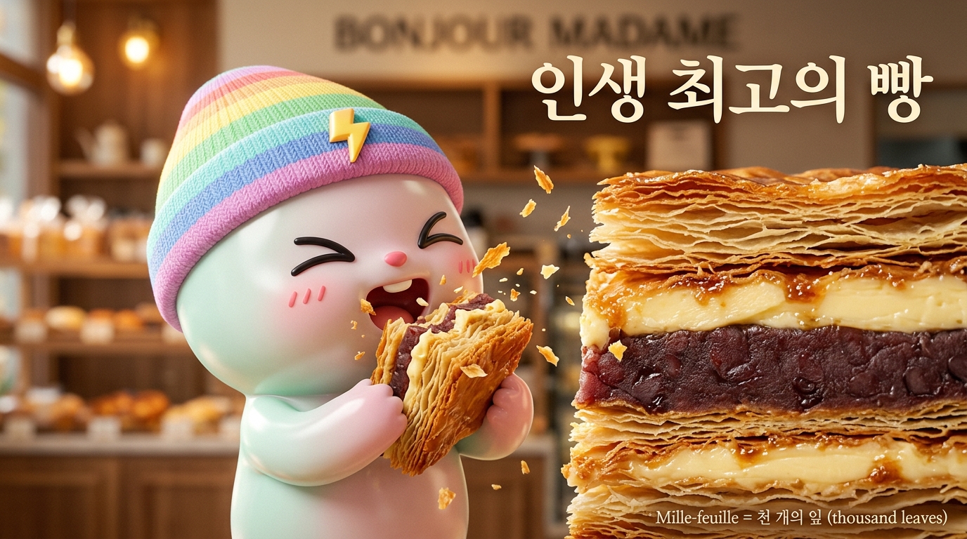 이제 가장 중요한 이야기야. 밀푀유(Mille-feuille)라는 단어를 알아? 프랑스어로 '천 개의 잎(mille=thousand, feuille=leaf)'이라는 뜻이야. 그 이름에 걸맞게, 이 빵은 정말 얇은 파이 시트를 겹겹이 쌓아서 만드는 거거든. 다만 봉주르마담의 밀푀유 앙버터는 정통 프렌치 밀푀유와는 조금 달라. 여기에 팥(앙)을 채워 넣었거든.